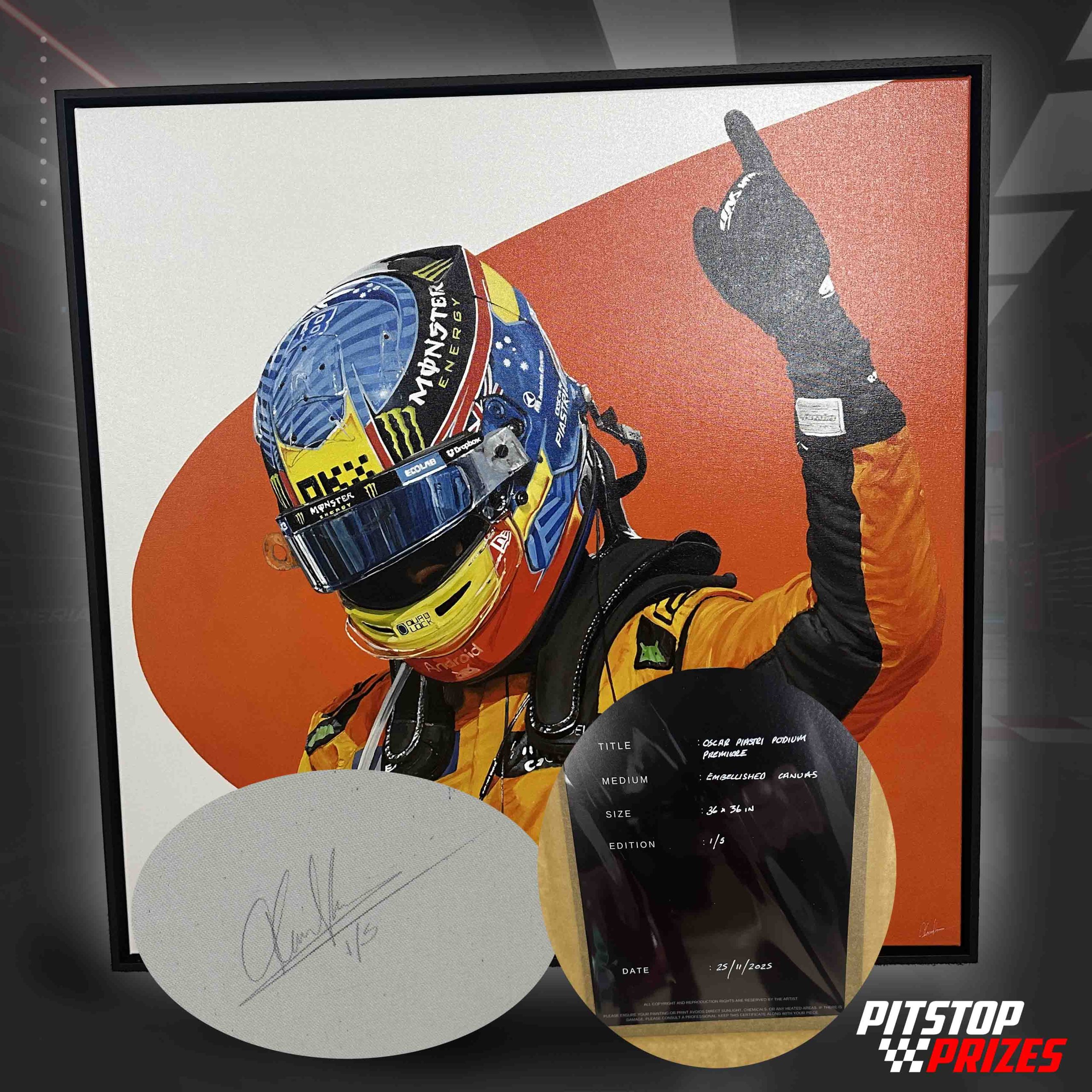 This stunning embellished canvas artwork by renowned motorsport artist James Stevens captures Oscar Piastri’s first-ever Formula 1 race victory, frozen in time as a celebration of a breakout moment at the top level of the sport.