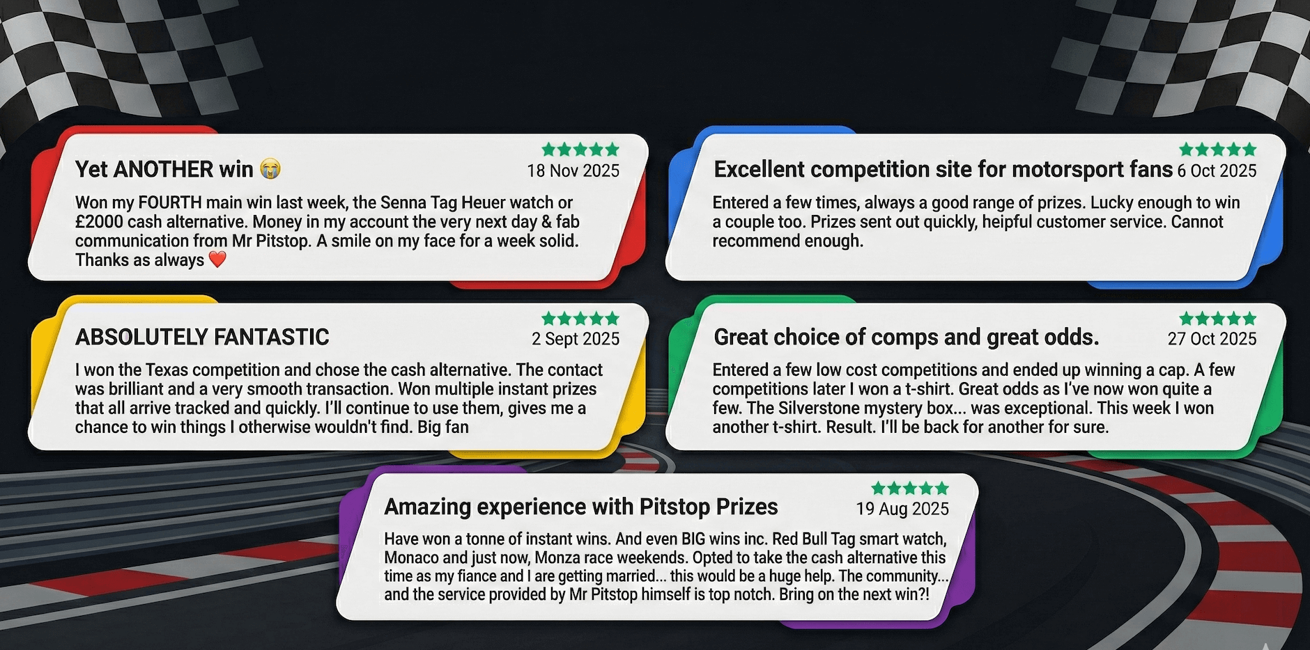 All draws are guaranteed. Physical items are subject to stock and availability; if unavailable, equivalent site credit may be provided. Instant Pitstop Prizes are fulfilled after the live draw. Duplicate wins for limited-quantity items may be replaced or credited. Cash alternatives apply only where stated. By entering, you agree to these terms.