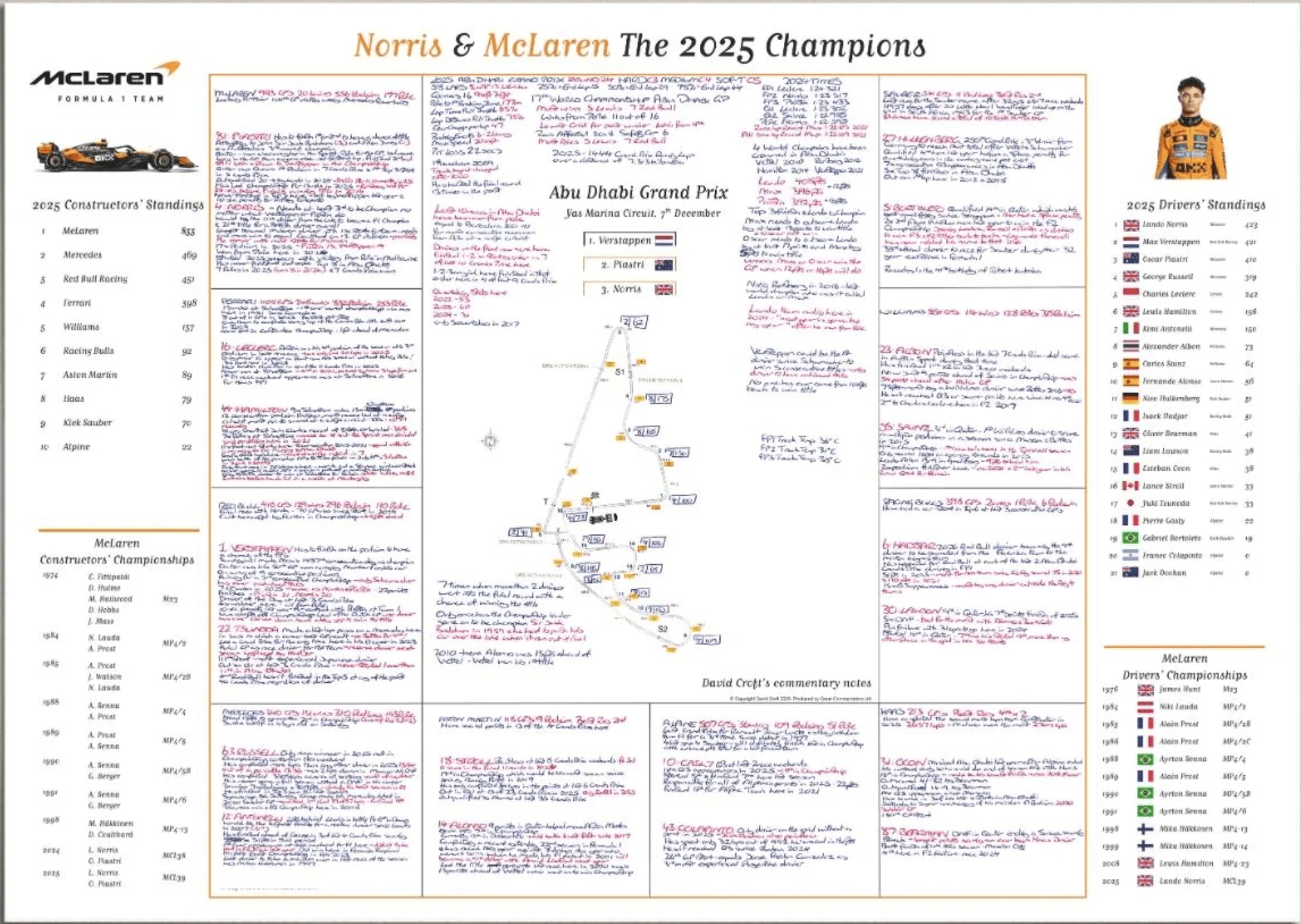 • A2 framed special-edition prints signed by David Croft, capturing key Lando victories from the Silverstone & Abu Dhabi 2025 grand prix!