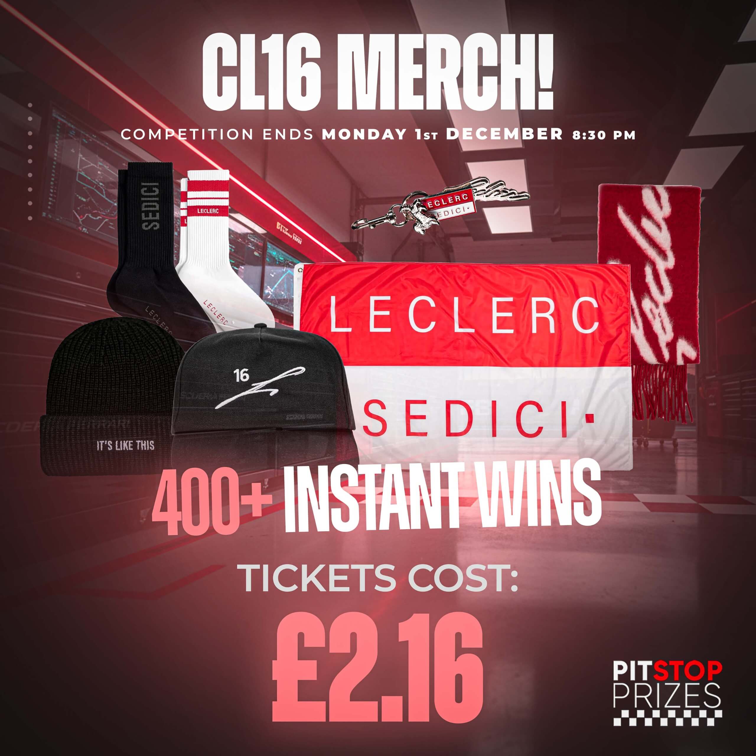 We are not authorised by or associated with Charles Leclerc, Ferrari, Formula 1, or any motorsport team. All prizes are officially licensed merchandise sourced from authorised distributors.